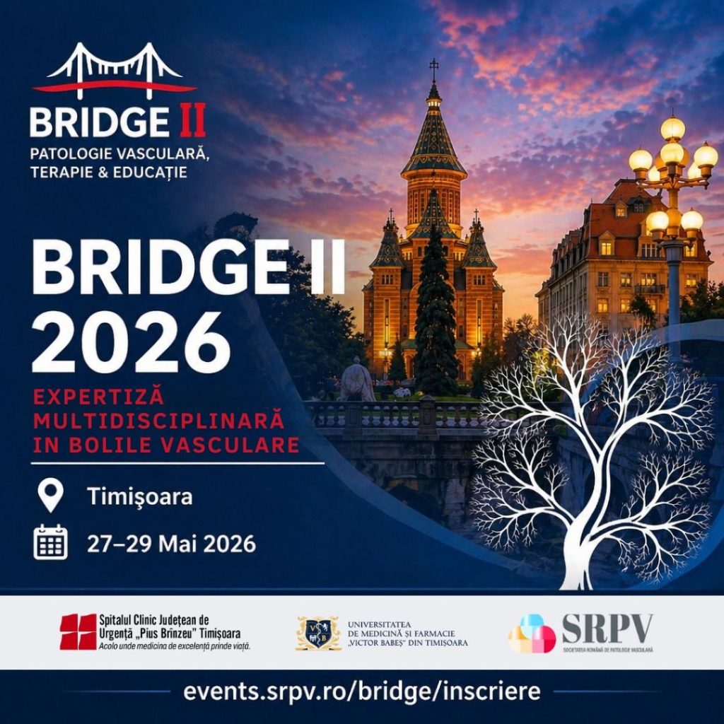 Societatea Română de Patologie Vasculară (SRPV), în parteneriat cu Spitalul Clinic Județean de Urgență „Pius Brînzeu” Timișoara și Universitatea de Medicină și Farmacie „Victor Babeș” Timișoara, vă invită să participați la BRIDGE II – Bridging Expertise in Vascular Diseases, ediția a doua a congresului științific dedicat abordării multidisciplinare a patologiei vasculare.