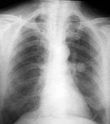 Opacitate bine delimitată, mediopulmonar stânga cu zone de calcificare - tumoră benignă